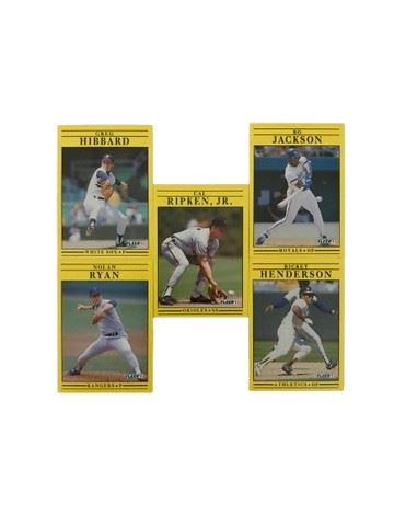 Own a slice of baseball history with this incredible collection of five iconic 1991 Fleer baseball cards. Featuring Hall of Famers Nolan Ryan and Cal Ripken Jr., alongside powerhouses Bo Jackson and Ricky Henderson, plus the enigmatic Greg Hibbard, this lot is a must-have for any serious collector. Don't miss this opportunity to own cards from some of the greatest players of the era. Condition: mint