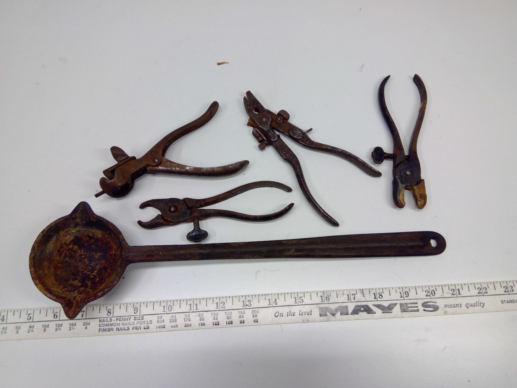 (5) Forging/Blacksmith Tools, “Bullet” Making, Gold Smelting. (1) made in Germany, double pourer 16
