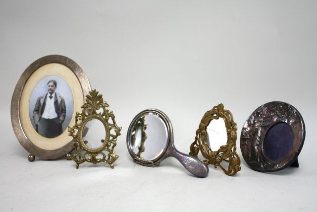Including, sterling silver etched oval frame, approx. 12" x 9", round Art Nouveau frame, approx. 6 1/2", brass Art Nouveau frame, brass frame, sterling silver hand mirror. From a private NYC estate.