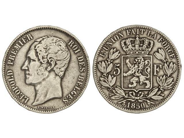5 Francos. 1850. LEOPOLDO I. AR. Punto encima de la fecha. (Pequeños golpecitos y pequeñas rayitas). KM-17. MBC.