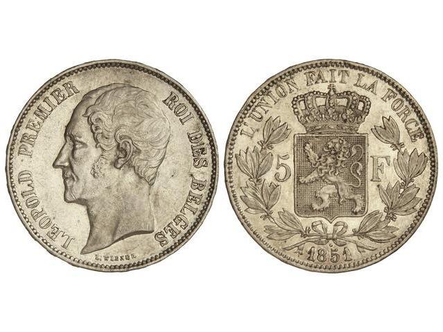 5 Francos. - 1851. - LEOPOLDO I. - AR. Punto encima fecha. (Pequeñas rayitas y golpecitos). KM-17. EBC-. - -
