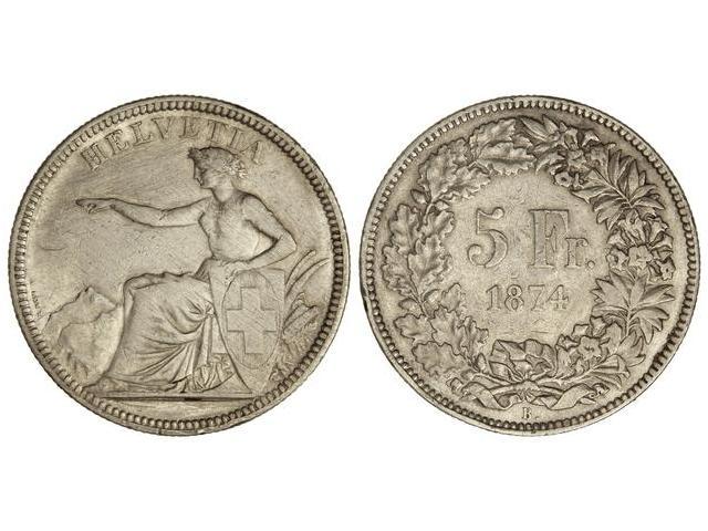 5 Francos. 1874-B. AR. (Múltiples rayitas y pequeños golpecitos). KM-11. MBC-/MBC.