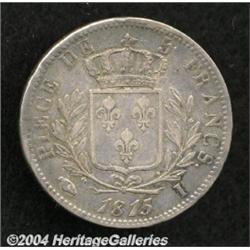 <B>5 Francs 1815-I First Restoration,</B></I> KM702, F-VF. <BR><BR><B>Important notice:</B> Heritage usually auctions material at the rate of 200-250 lots per hour. On some occasions eBay Live bid software or the Internet may not be able to keep up with the pace of the auction. We recommend placing a realistic absentee bid now as insurance to avoid disappointment. Occasionally the auctioneer may eliminate or reject an eBay Live bid, and the auctioneer may also reopen a lot after the close of the eBay live bidding (usually because we missed an audience bid), and may reject your bid even if it shows you as the winning bidder. By bidding via eBay Live, you agree that Heritage may award the lot to another bidder at its sole discretion under the circumstances described above or any other reasonable circumstances. Since eBay bids are not shown to us until we open the lot on the floor, we treat those bids just like floor bids. In most cases the floor responds before the eBay bid is presented to us, due to Internet lag time, so for consistency we have made it a policy that floor bids are always considered first over tie eBay live bids. Also please note that all Heritage lots purchased through eBay Live carry a 20% Buyer's Premium. Please make sure you read the Terms and Conditions before you bid.
