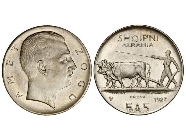 5 Franga Ari. 1927-V. ZOG I. Rev.: Yunta, arado y campesino. AR. PROVA. (Pequeño golpecito en anverso). KM-Pr22. PRUEBA.