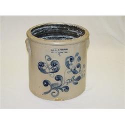 5 GAL. O.L. & A.K. BALLARD CROCK W/ LARGE COBALT FLOWER DECORATION - BURLINGTON VT - INTERIOR STAINS & MINOR SPOTS OF PITTING AROUND BASE