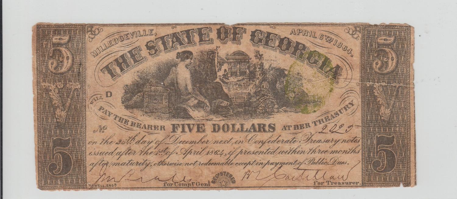$5 GEORGIA OBSOLETE 1864 CURRENCY