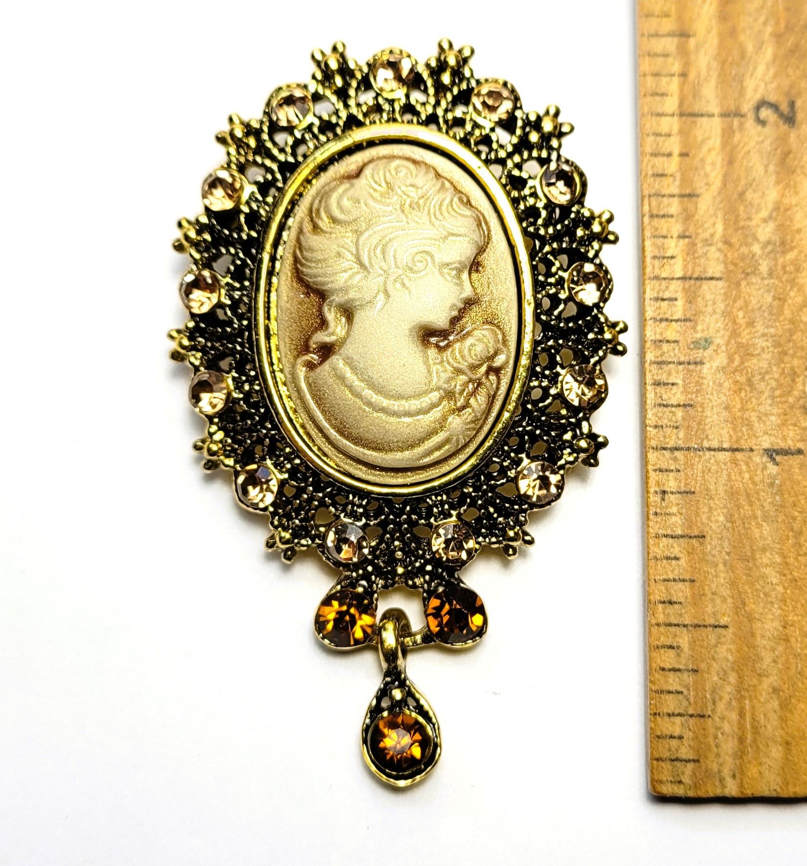 BROOCH, WITH FILIGREE SETTING AND AMBER COLORED CRYSTAL EMBELLISHMENTS. JEWELRY