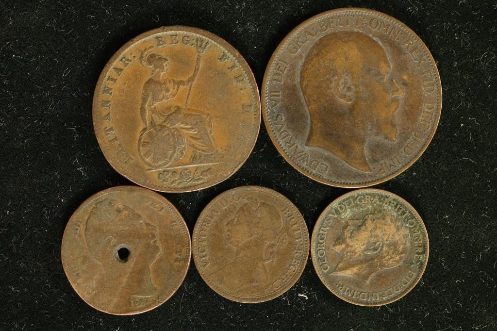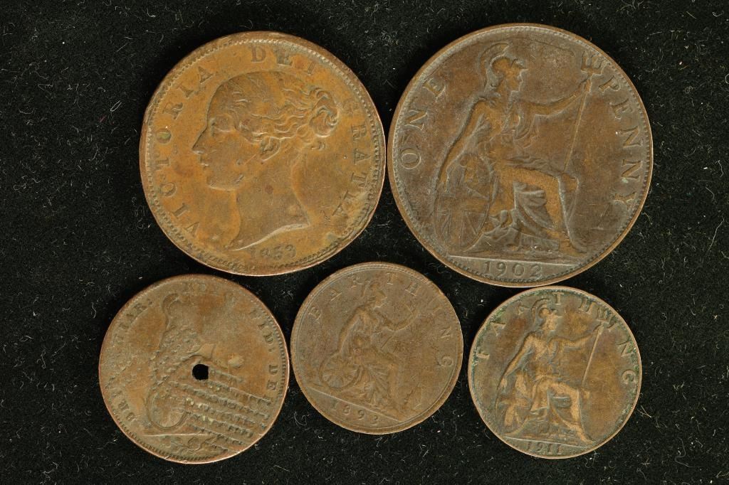1902-1 PENNY, 1831 (DAMAGED) FARTHING, 1893 FARTHING AND 1911 FARTHING