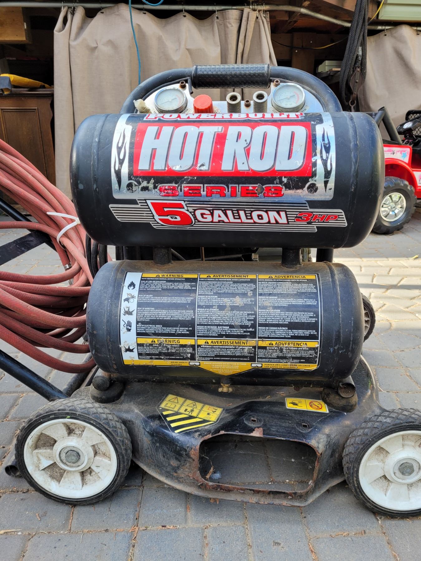 5 Gallon Air Compressor with hose carrier, mounted on a lawn mower chassis for easy moving.