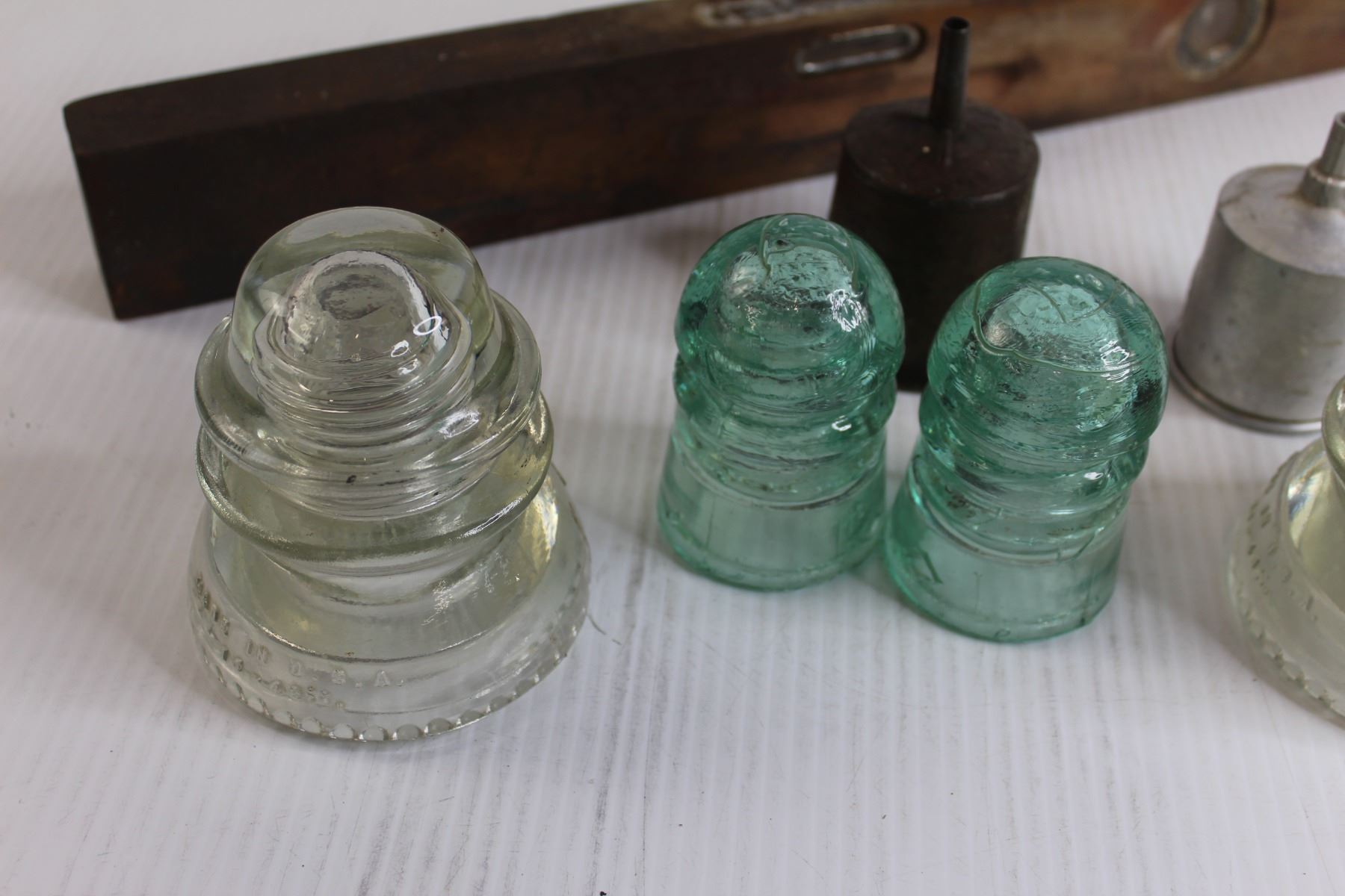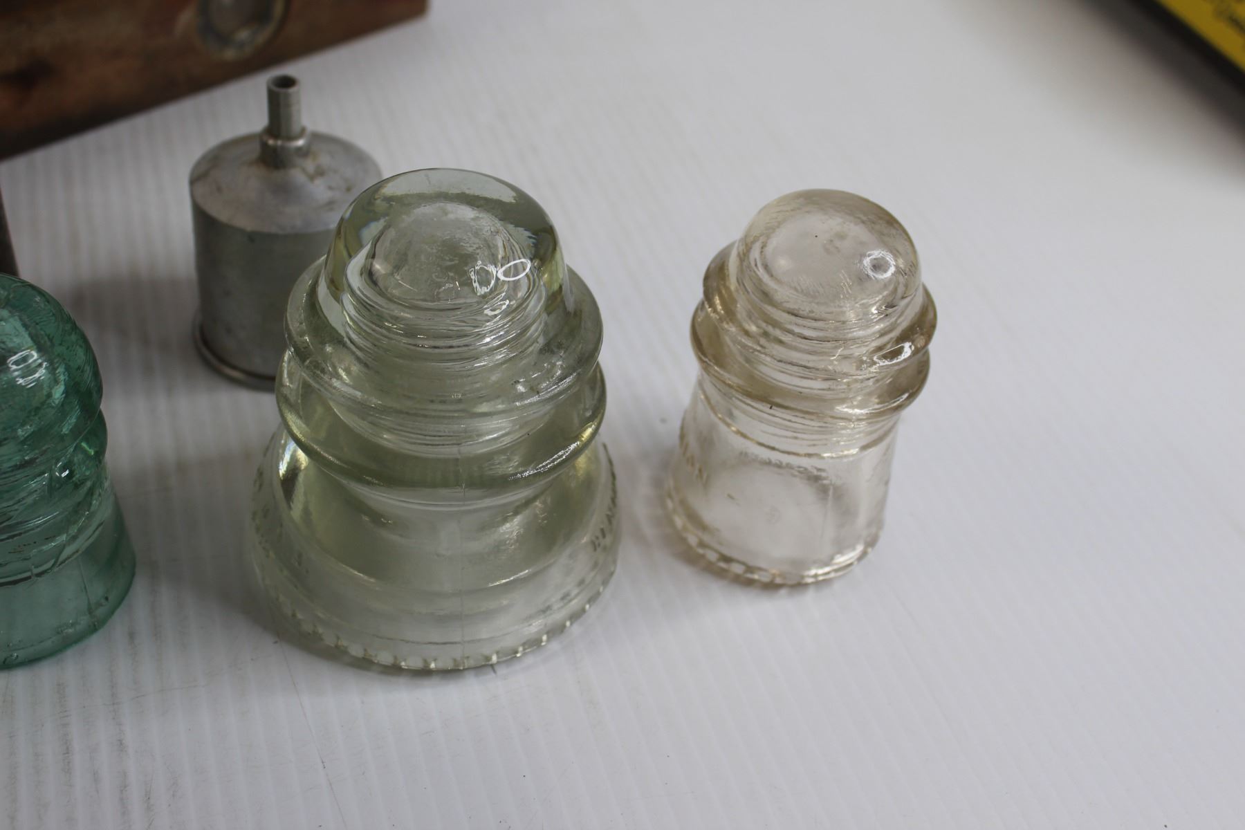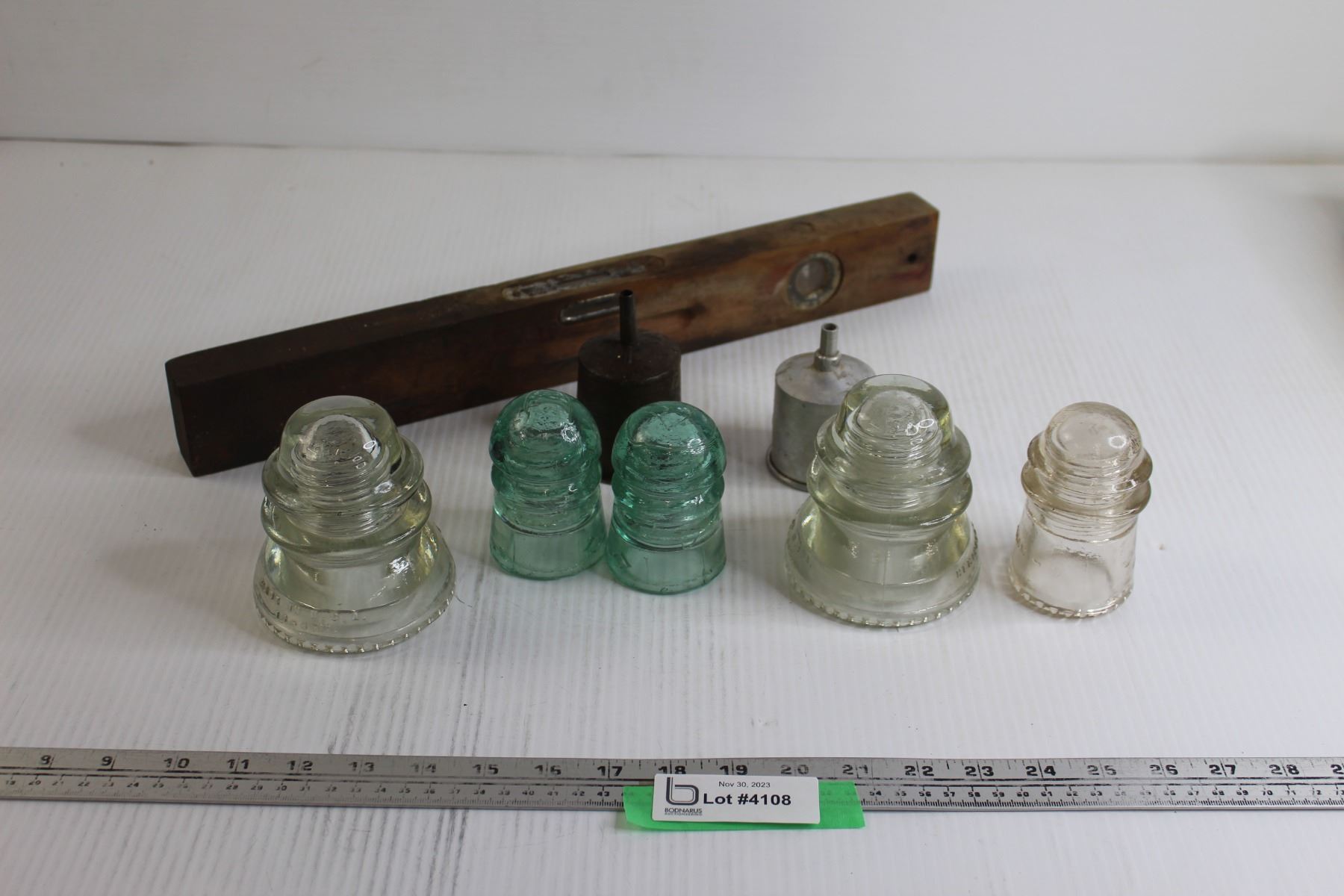 (5) Glass Insulators, (2) Coleman Funnels, Level