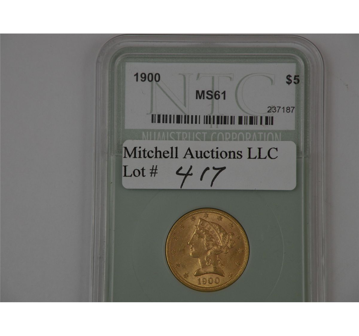 $5 Gold 1900 NTC MS61. A frosty, appealing example with no large, overly distracting defects. Est.$375