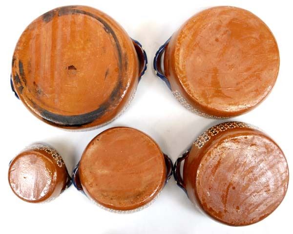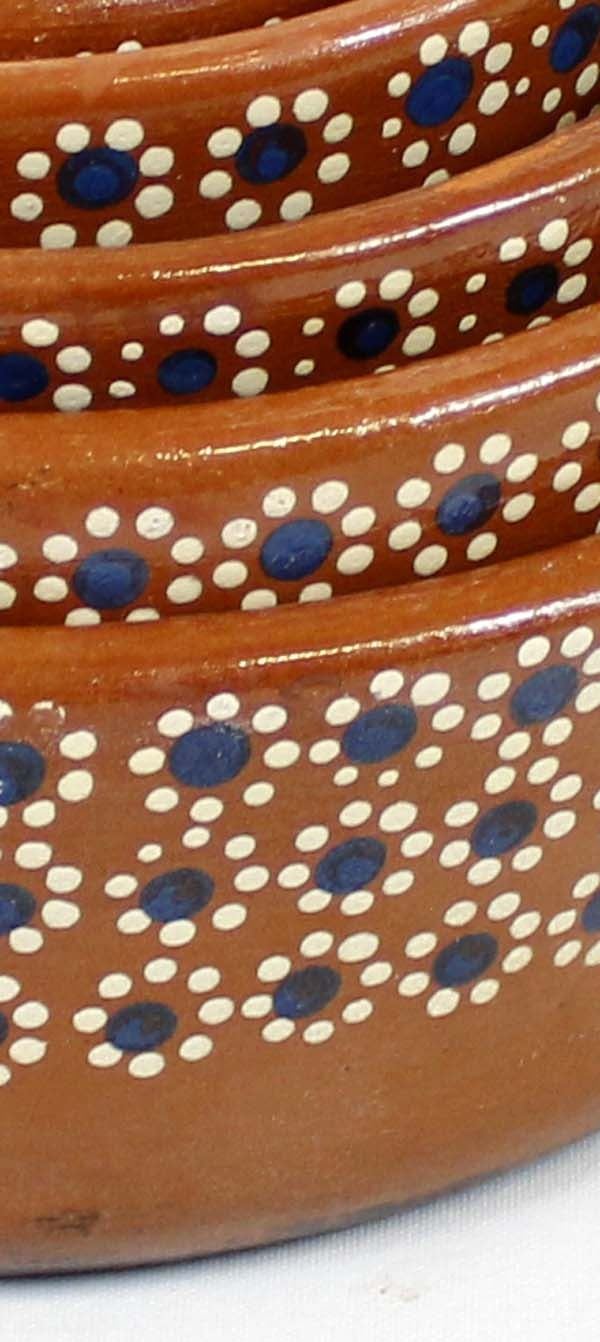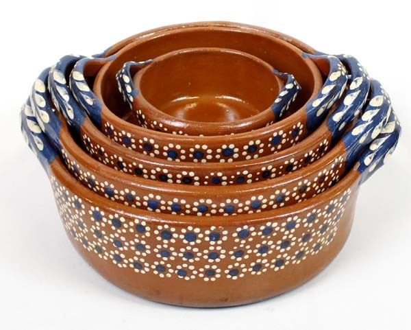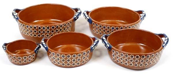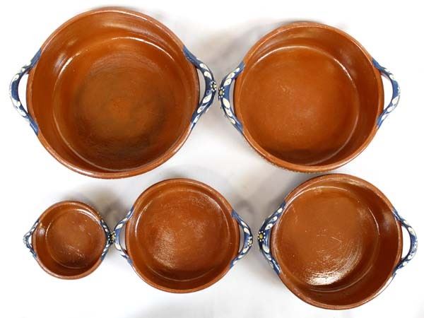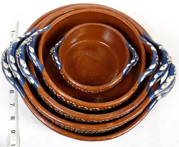 5 Mexican Graduated Redware Pottery Bowls with Blue & White Handles. Largest measures 12'' in diameter.
