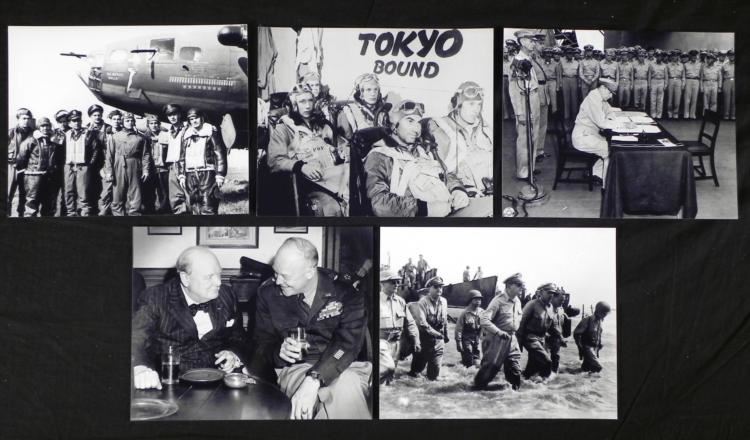 Here are 5 photographs that represent great rare WWII photos. These are 8 x 10 black & white glossy high quality archive reprints. All are in excellent condition They feature: WWII Pilots Tokyo BoundWinston Churchill & Dwight EisenhowerDouglas MacArthur Signs Japanese SurrenderWWII B-17 Memphis Belle & Crew USAFGen. Douglas MacArthur's Return