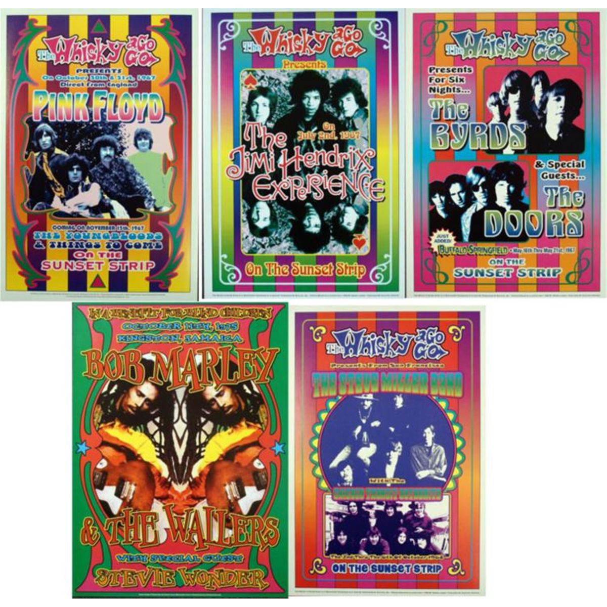 This is a group of 5 reproductions of original concert posters, four from The Whisky a Go Go in Los Angeles, and one from Jamaica, featuring some awesome 1960's and 70's groups. * Size: 13 1/2" x 20" (approximately) Medium: Heavy Poster Stock Condition: Excellent The artists include: Pink Floyd (with Syd Barrett), 1967The Byrds and the Doors with Buffalo Springfield, 1967The Steve Miller Band with Chicago Transit Authority Jimi Hendrix Experience, 1967Bob Marley, 1975Please note: These are reproductions printed in 1999, not original concert posters *