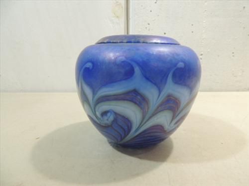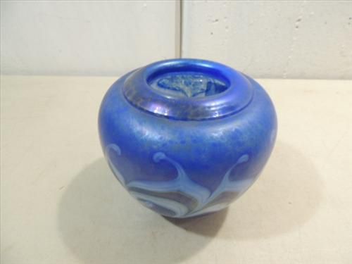 5"H HAND BLOWN BLUE IRIDESCENT ART GLASS BUD VASE. NO MAKER MARK. AS SHOWN. VIEW PICTURE FOR DETAIL.