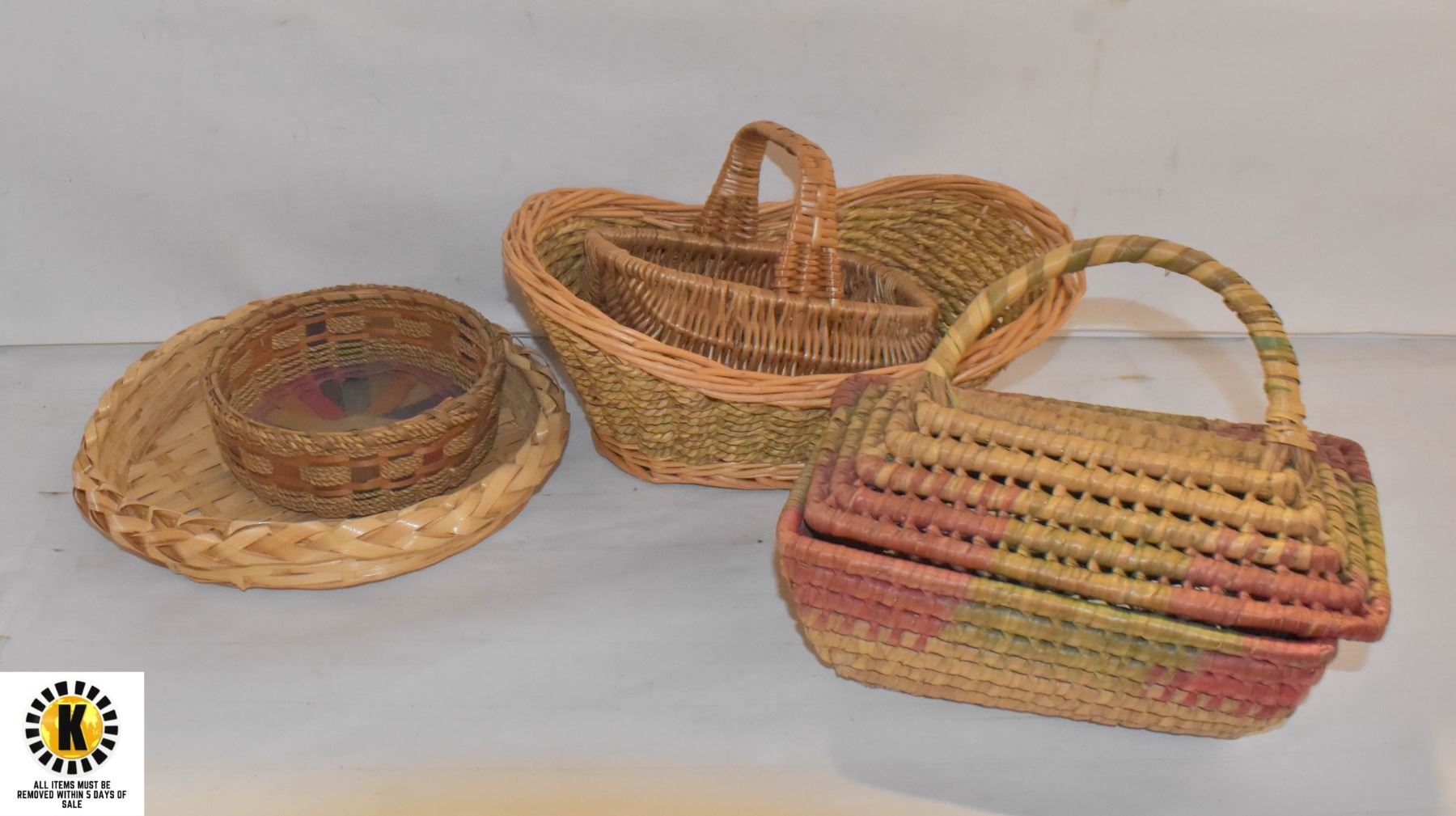 5 HAND WOVEN REED & ASSTD BASKETS. ESTATE