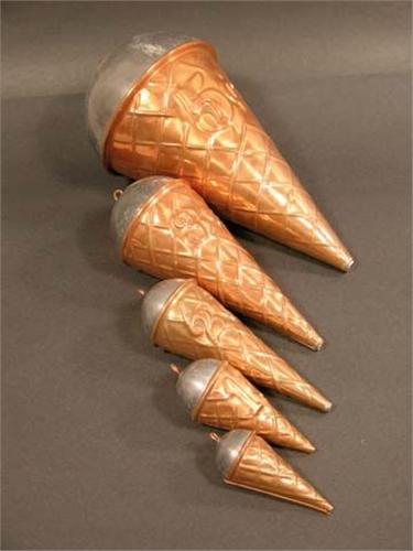 Set of 5 hanging copper ice cream cones store display(s). 5 cent - 13" long/3 cent - 9" long/2 cent - 7" long/1 cent - 5" long/free - 3.5" long. Ex. cond.