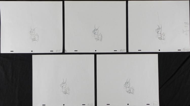 Holding on for dear life! * * 5 Original Animation DrawingsDetails: Animation notations and peg holes * Original "rough" animation drawing, in black pencil * Size of drawing: 10 1/2 x 12 1/2 inches * Condition: Very good * Traditional animation is a * multi-step process which includes various types of art techniques. * Drawings are a key part of the process, in which the animator creates * the design and movement of the characters. Drawings are then transferred * onto acetate cels. There are 5 different drawing that are in a sequence