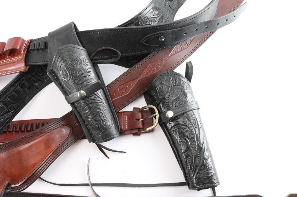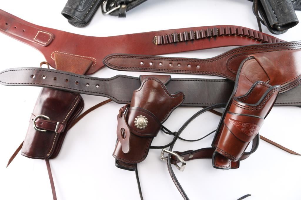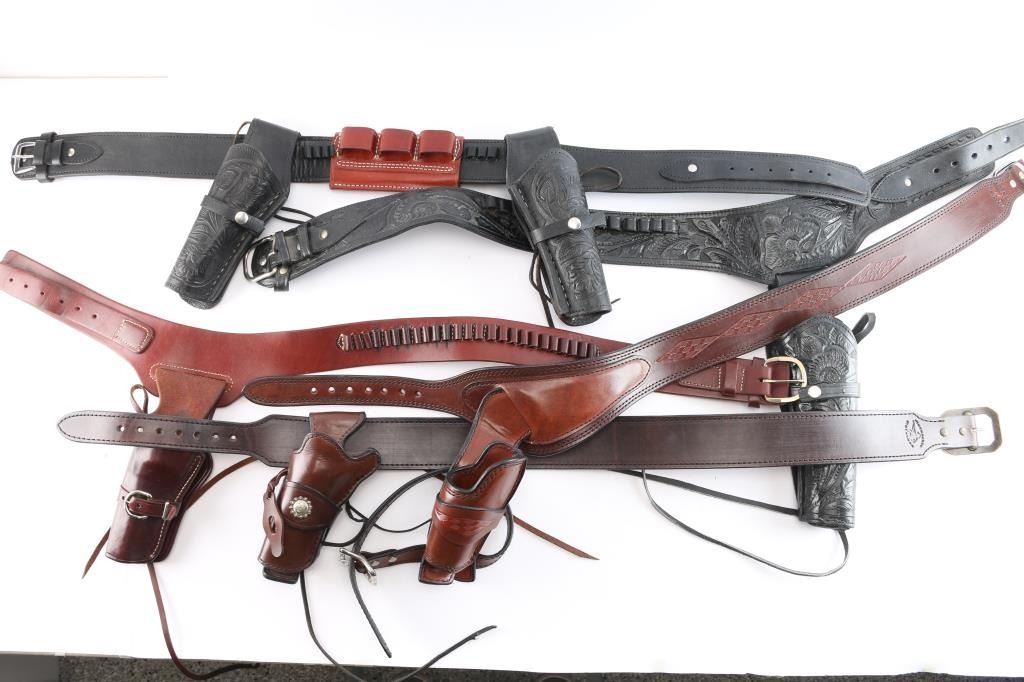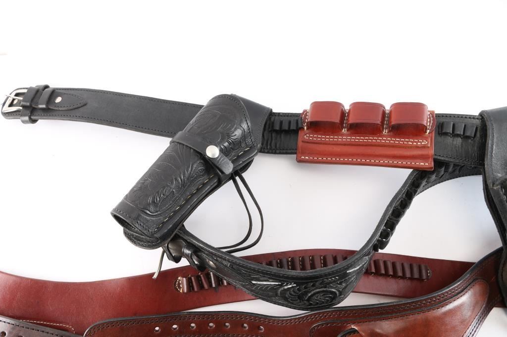 Includes: 1) Mernickle holster/belt rig. CFDA approved , brown leather, size 40" belt, single loop holster (D15) with concho for 4" revolver. 2) Triple K holster/belt rig, brown leather belt, size 38, with cartridge loops (Fit .38's) single loop with buckle revolver holster. 3) Mernickle FD7 "Fast-Draw" holster rig brown leather, belt size 40", single loop revolver holster with leg strap. 4) "Made in Mexico" black leather, tooled holster rig, single loop holster for 7" revolver, size 38" belt with .44/.45 cartridge loops. 5) Mexican black leather double holster rig, single loop, tooled holsters, belt size 40, .38 cartridge loops and Triple K 736 Cowboy Competition Belt Slide Shotgun Ammo Carrier 6-Round 12 Gauge, tan leather. All of the holsters/rigs are in very good condition.