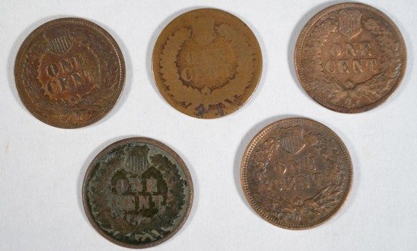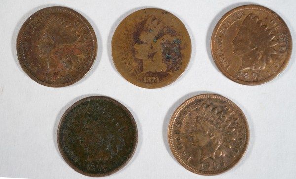5 INDIAN HEAD CENTS: 1873 AG DAMAGE, 1875 G, 1889 VG/F, 1891 VG/F, 1906 XF