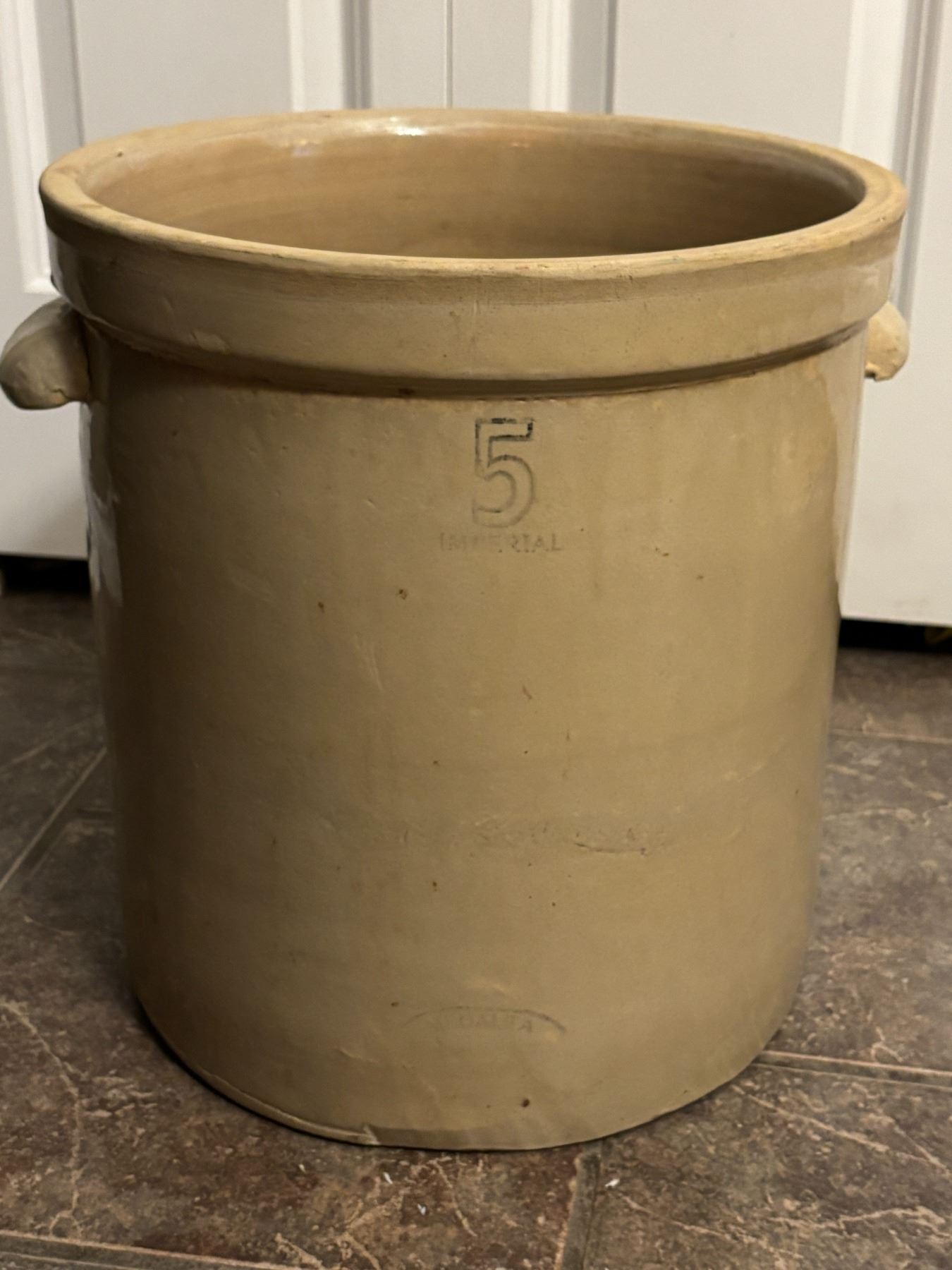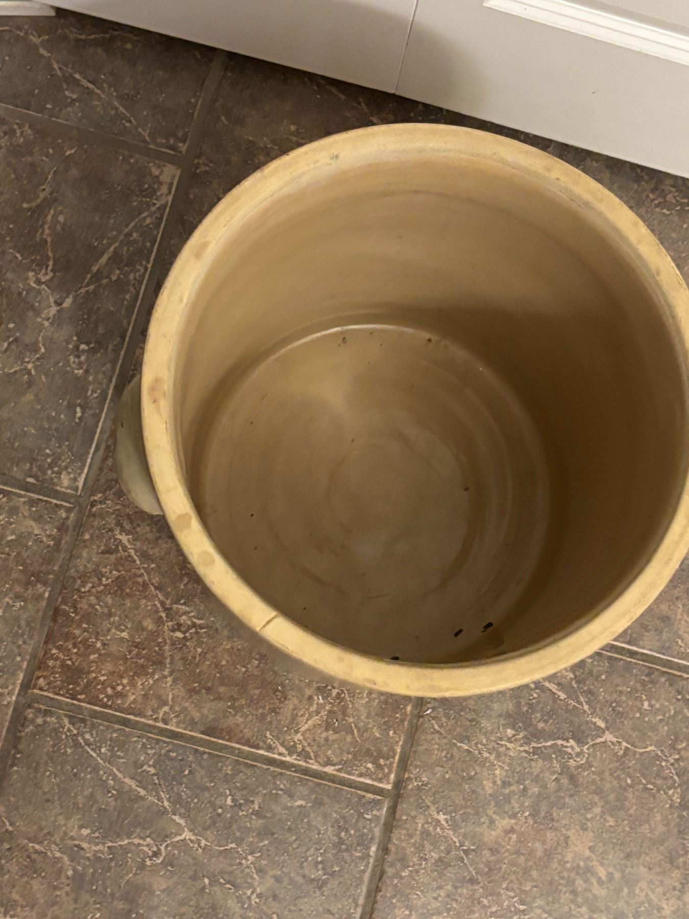Crock with handles, 5 Imperial Gallons, no chips/cracks, 14.5” high x 15” wide