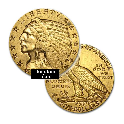 One piece $5 Gold Coin Indian Head - Half Eagle Bullion Coin 1/4 Oz (1908 - 1929). CIRCULATED - Dates Of Our Choice