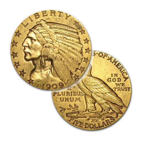 One piece $5 Gold Indian Head - Half Eagle Bullion Coin 1/4 Oz (1908 - 1929). CIRCULATED - Dates Of Our Choice