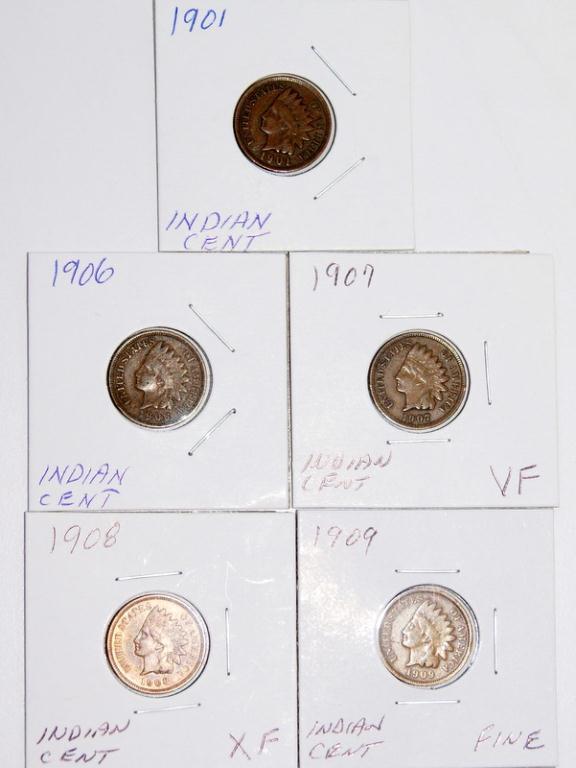 (5) Indian Pennies - 1901, 1906, 1907, 1908 and 1909 - Excellent Condition - Sold Times the Money Pennies (5) Indian