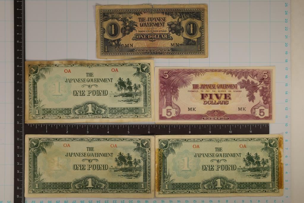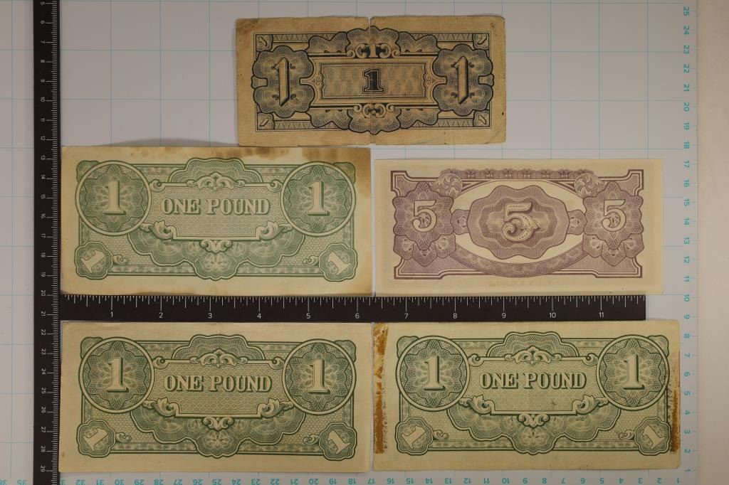 1 DOLLAR, 5 DOLLARS AND 3-1 POUND NOTES, OLD TAPE MARKS ON ONE BILL