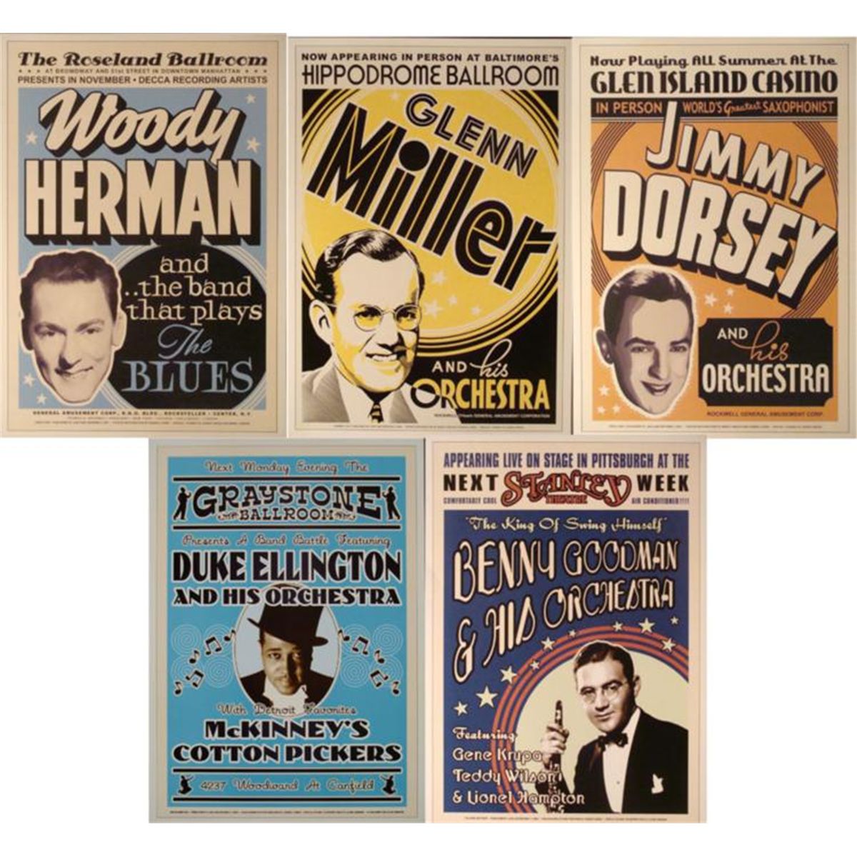 This is a group of 5 reproductions of original concert posters highlighting some of the greatest voices of jazz. * Size: 17" x 24Medium: Heavy Poster Stock Condition: Excellent The artists include: Dizzy Gillespie with Ella Fitzgerald, Paradise, Detroit, 1947 Billie Holiday, Town Hall, New York, 1946Sarah Vaughan, Miles Davis, & James Moody Howard Theatre, Washington D.C., 1960 Louis Armstrong and his orchestra, Connies's Inn, 1935 Cab Calloway, The Cotton Club, New York, 1931Please note: These are reproductions, not original concert posters *