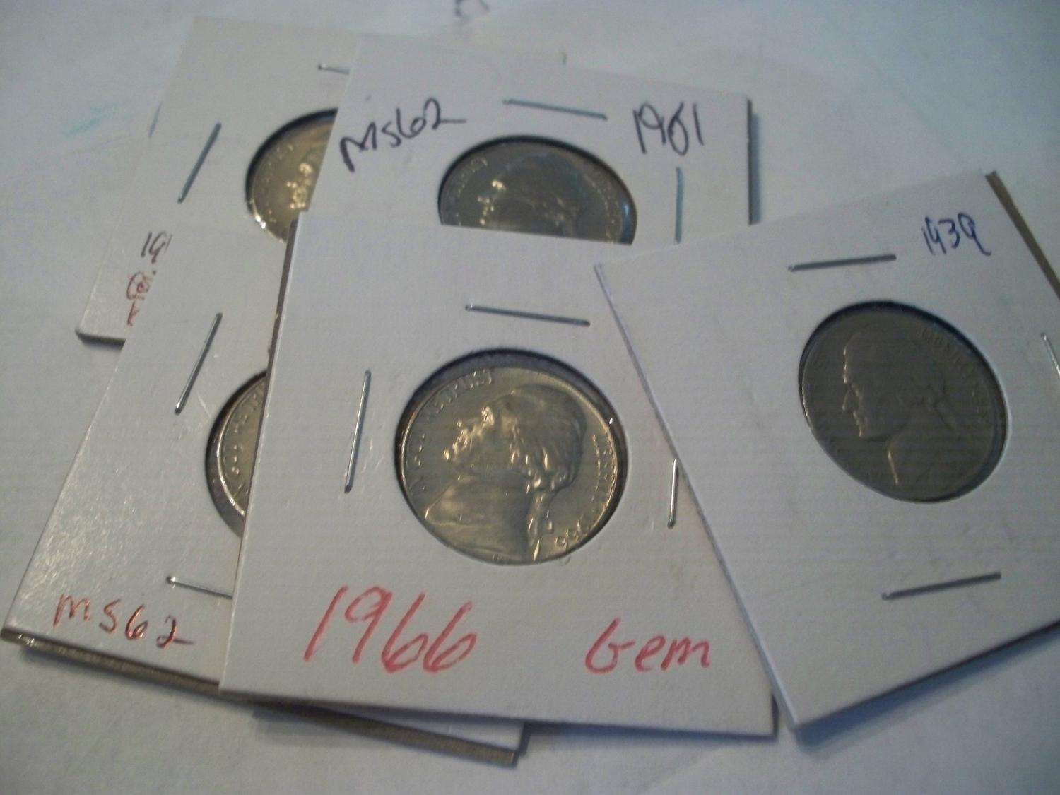 5 Jefferson Nickels, 4 MS, 1 Gem