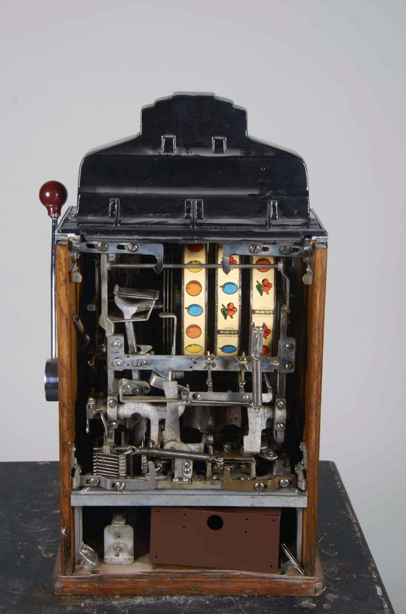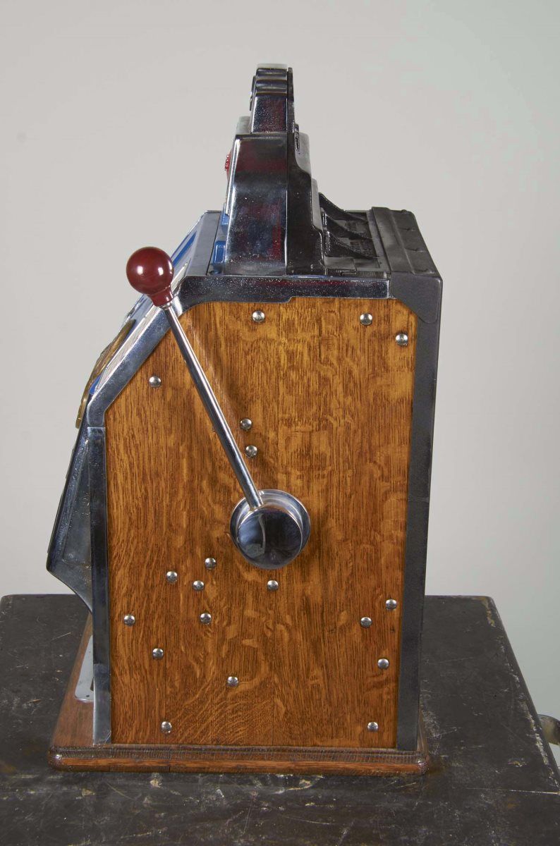5 Cent Jennings Chief Escalator Bell Slot Machine, Front casting features Indian hunting scene, c1930s, Back bonnet is new, Works w/ key Condition (Very good). Size 15-1/2" x 28" x 15-1/2"