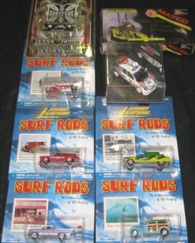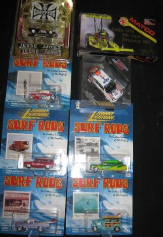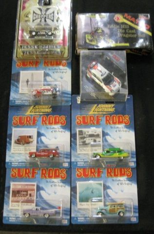 Ford Focus WRC Rallye Monte Carlo 2000 Collectors Edition, West Coast Choppers Jesse James Outlaw 666 Car, and Racing Champions Eddie Hill Die Cast Dragster Set.