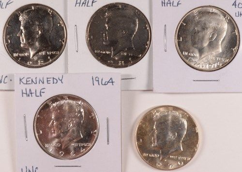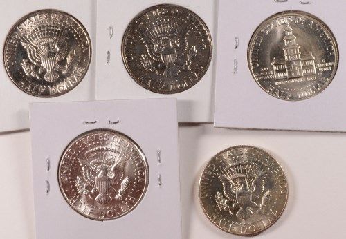 5 KENNEDY HALF DOLLARS (64,70-D,76-S 40 %, 2-81-P)