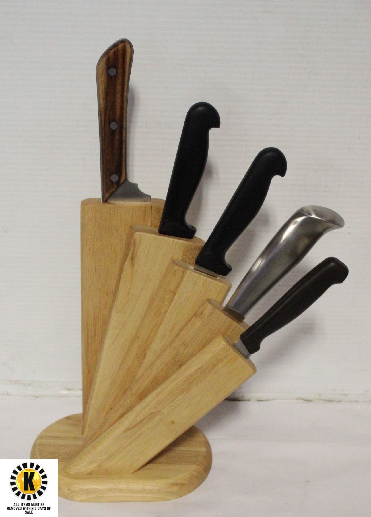 5 KNIVES ASSORTED BRANDS WITH WOOD BLOCK