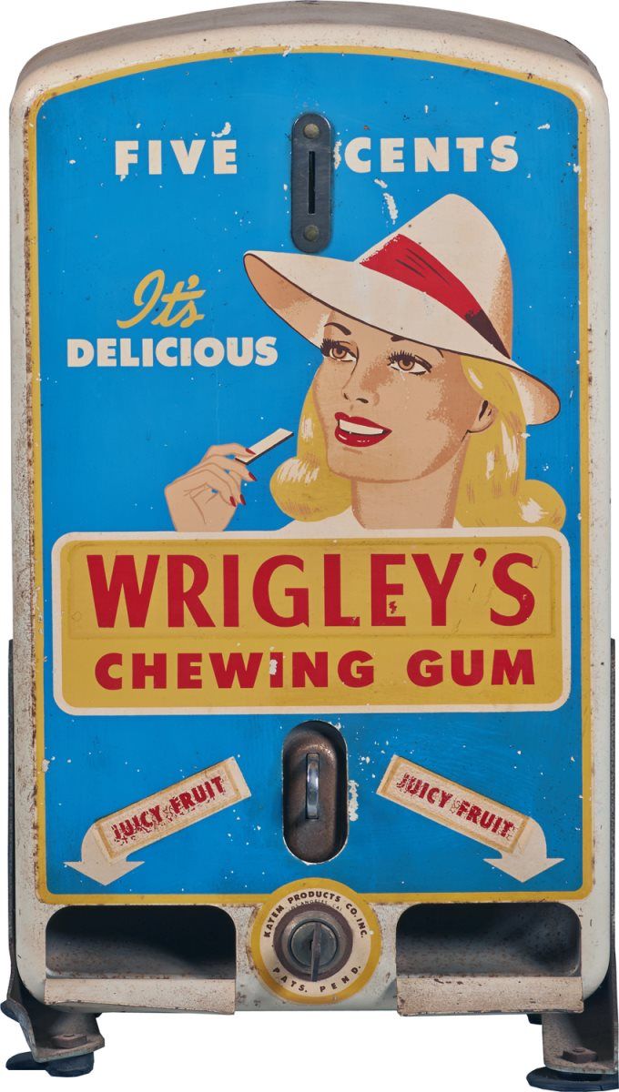 Countertop model vends Wrigley chewing gum. Circa 1947. Condition (Very Good). Size 14-1/2" x 8-1/2" x 5". Includes key