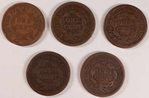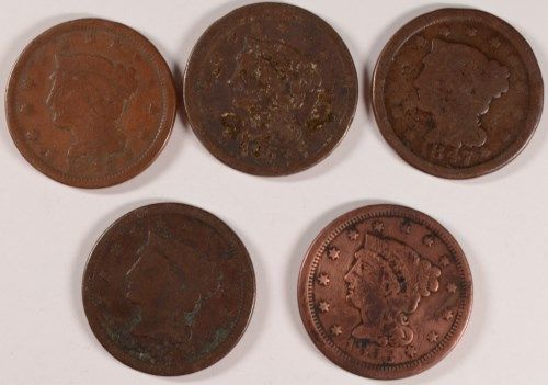 ( 5 ) LARGE CENTS READABLE DATES, 1846, 47, 48, AND 2 1853 LARGE CENTS