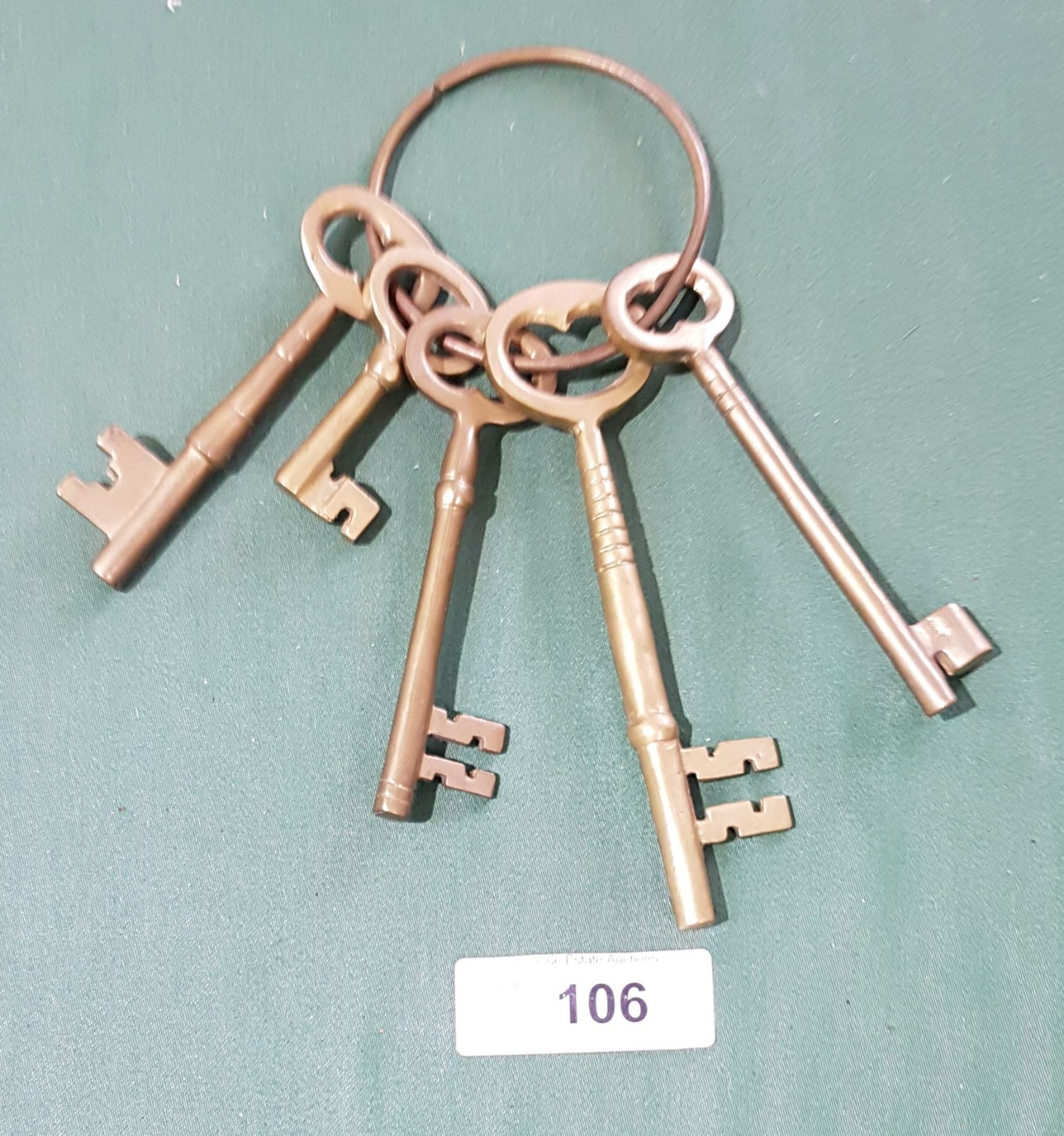 5 LARGE VINTAGE BRASS SKELETON KEYS ON RING