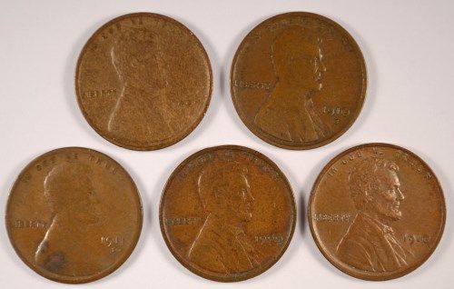 5 LINCOLN CENTS (09,09VDB, 10,10-S,11-D) GOOD-XF