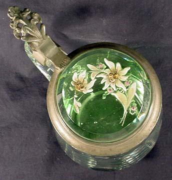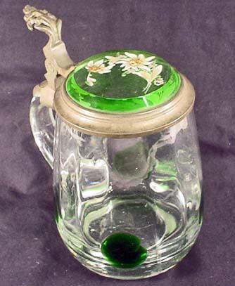 .5 LITER OLD GERMAN STEIN W/ HAND PAINTED GLASS TOP - Green coin dot design.