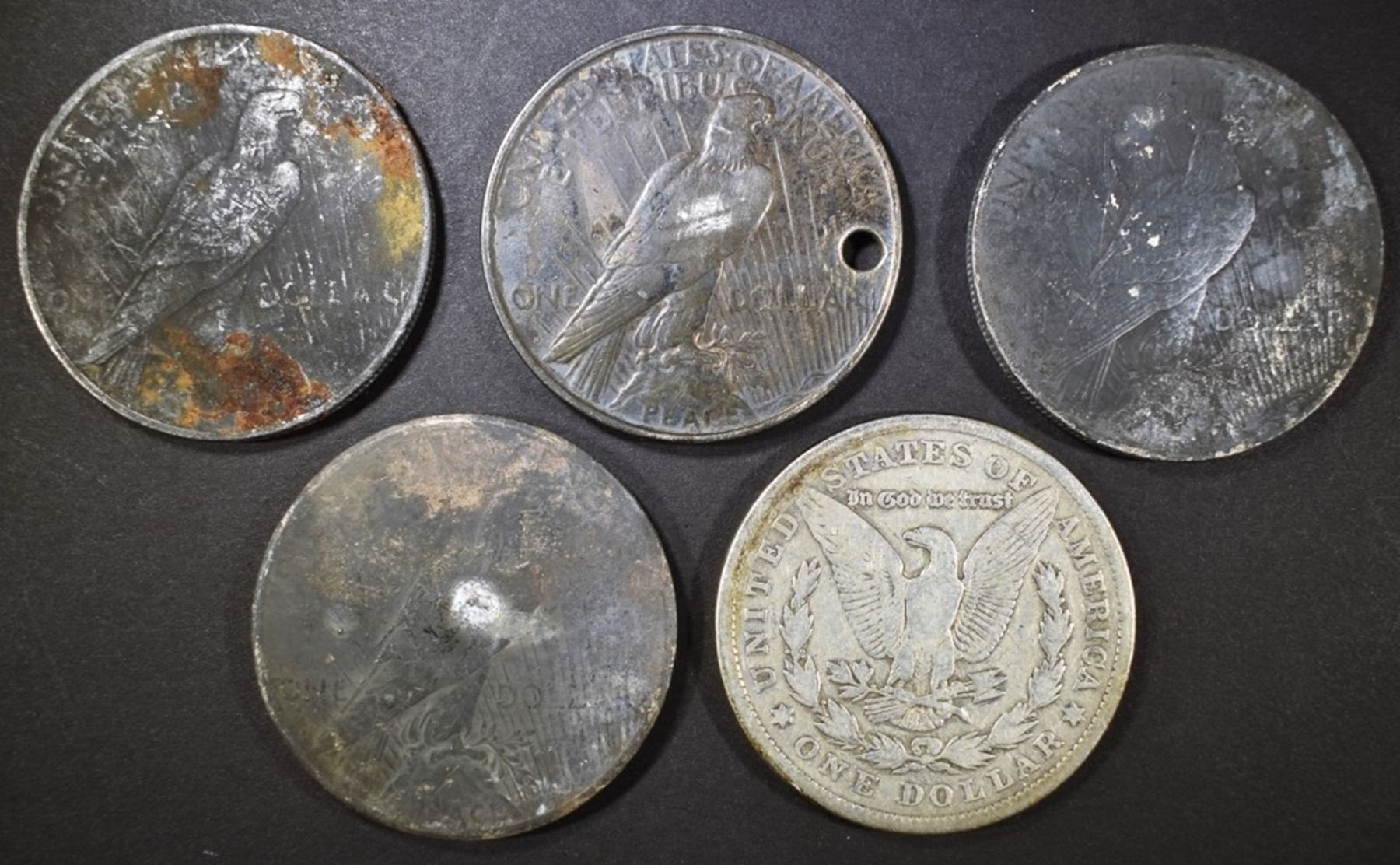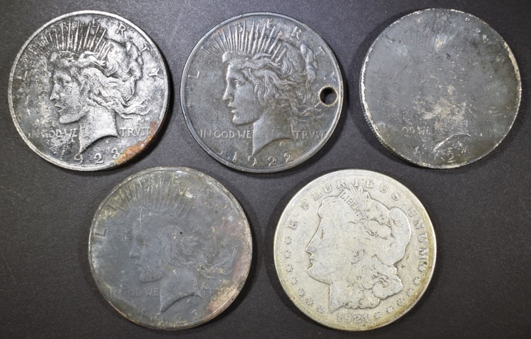 1-PEACE DOLLAR holed, 3-PEACE DOLLARS have went through a fire & 1921-S MORGAN ESTIMATE $90 - $100.