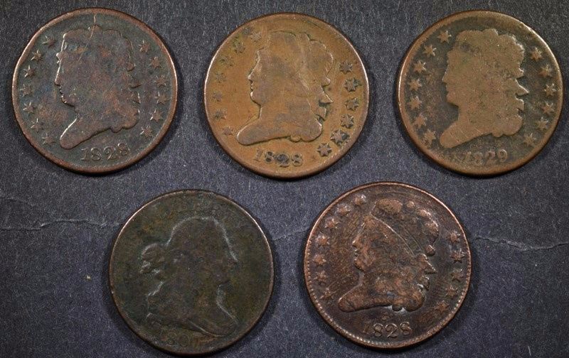(5) LOWER GRADE HALF CENTS: 1807, (3) 1828, & 1829 ESTIMATE $225 - $275.