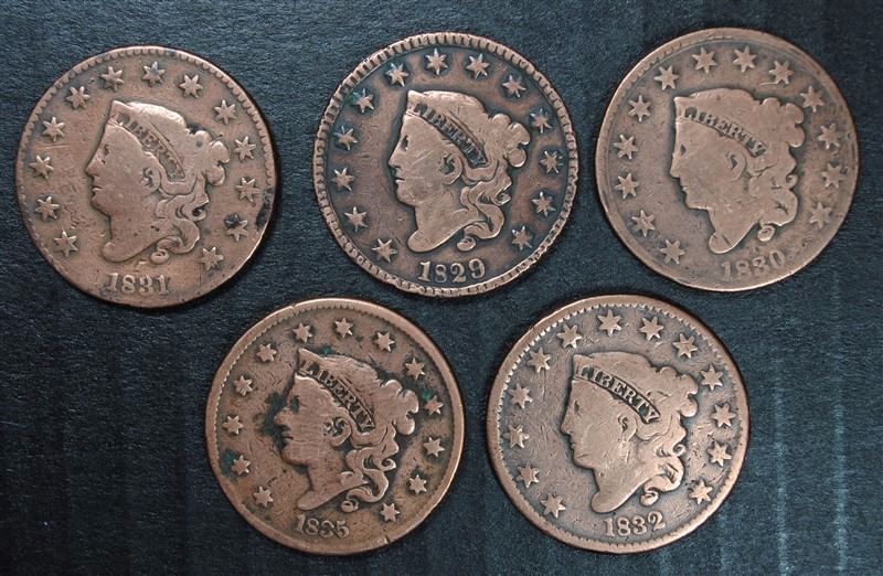 5 - LOWER GRADE LARGE CENTS; 1829, 1830, 1831, 1832, 1835