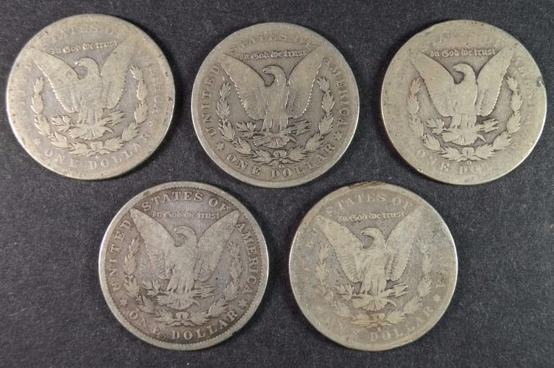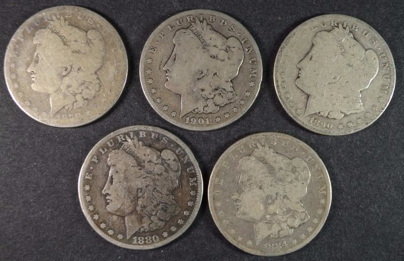 ( 5 ) LOWER GRADE MORGAN SILVER DOLLARS: 1879-O, 1890-O, 1901-O, 1884-S & 1880
