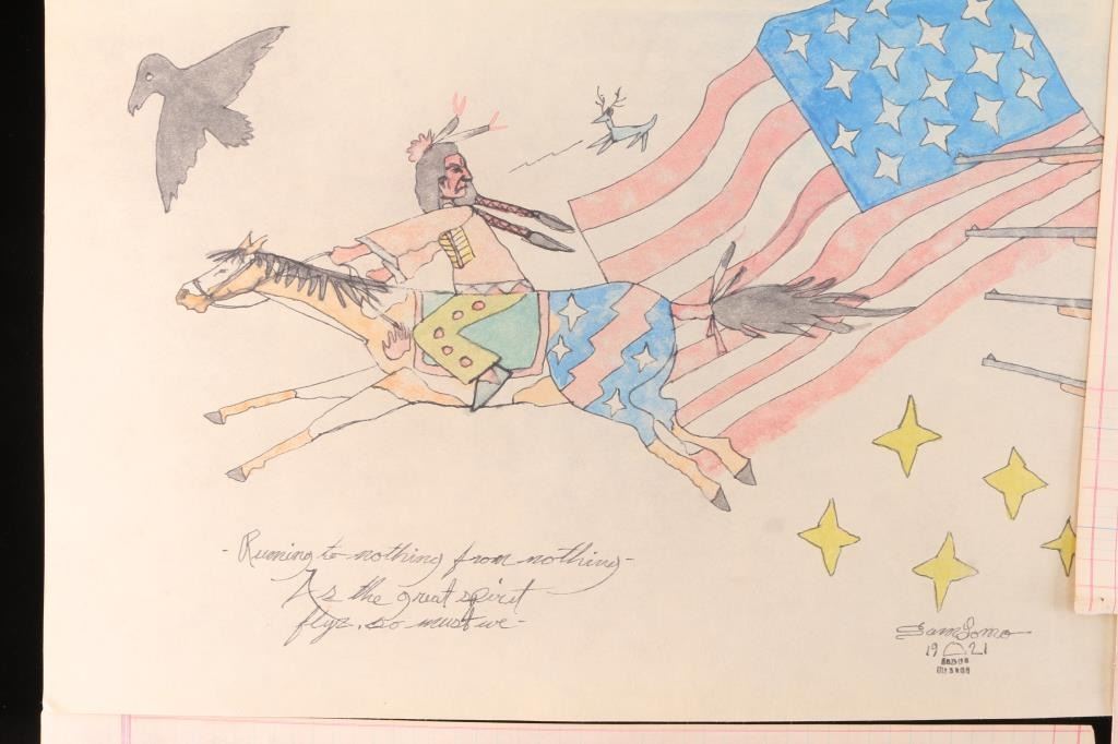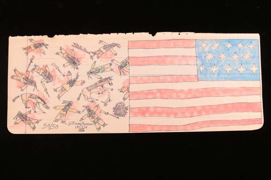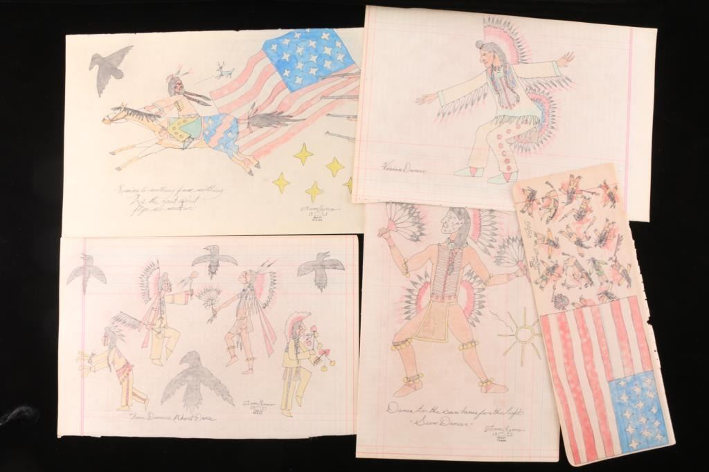Two dated 1921; three are dated 1922. One measures 14 1/2" by 6" and four measure 15 1/2" by 10 1/2". Ledger art is narrative drawing or painting on paper or cloth, predominantly practiced by Plains Indians but also from the Indigenous peoples of the Plateau and Great Basin. Ledger art flourished primarily from the 1860s to the 1920s. A revival of ledger art began in the 1960s and 1970s. The term comes from the accounting ledger books that were a common source of paper for Plains Indians during the late 19th century.