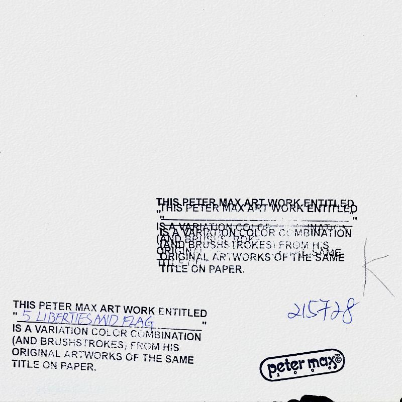 "5 Liberties and Flag" is a one-of-a-kind mixed media on paper, hand signed by Peter Max. The piece comes custom framed with a backside cutout to display Peter Max Studio registration number 215728 certifying authenticity. Measures approximately 28" x 24" (frame), 19" x 15" (image). This item requires special handling and may have a longer than usual turnaround.