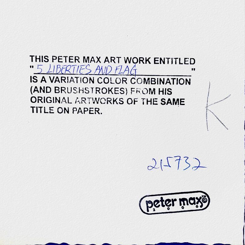 "5 Liberties and Flag" is a one-of-a-kind mixed media on paper, hand signed by Peter Max. The piece comes custom framed with a backside cutout to display Peter Max Studio registration number 215732 certifying authenticity. Measures approximately 28" x 24" (frame), 19" x 15" (image). This item requires special handling and may have a longer than usual turnaround.