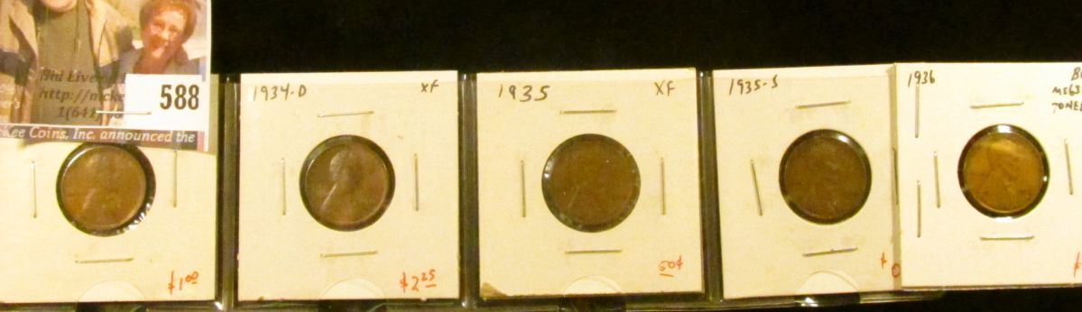 (5) Lincoln Cents, 1934 XF, 1934-D XF, 1935 XF, 1935-S VF, 1936 BU MS63BN toned, value for group $12