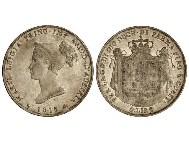 5 Liras. 1815. MARÍA LUISA, EMPERATRIZ. PARMA. AR. Restos de brillo. (Golpecitos en canto). ESCASA. C-30. MBC+.