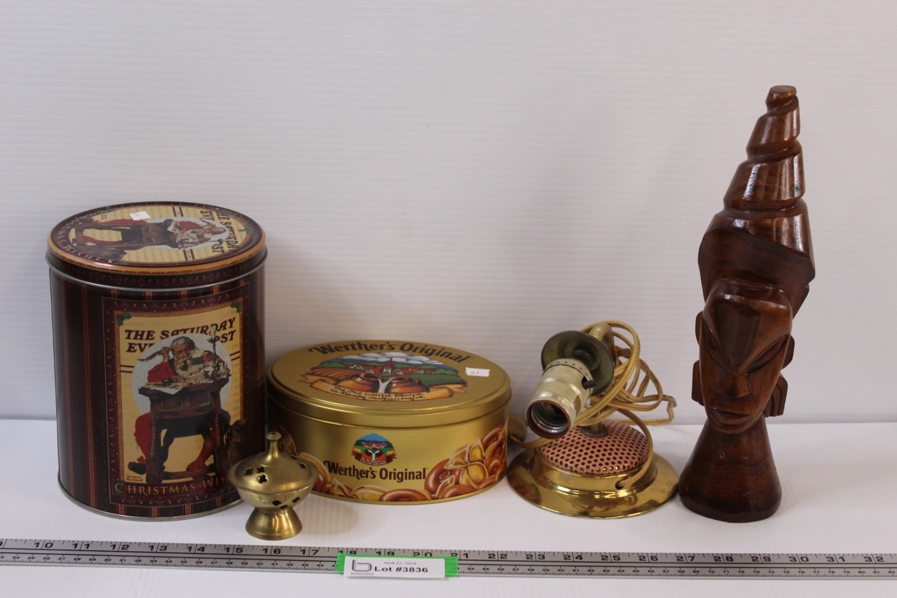 (5) Lot of Collectors Tins, Small Lamp Base Untested, African Wood Carving
